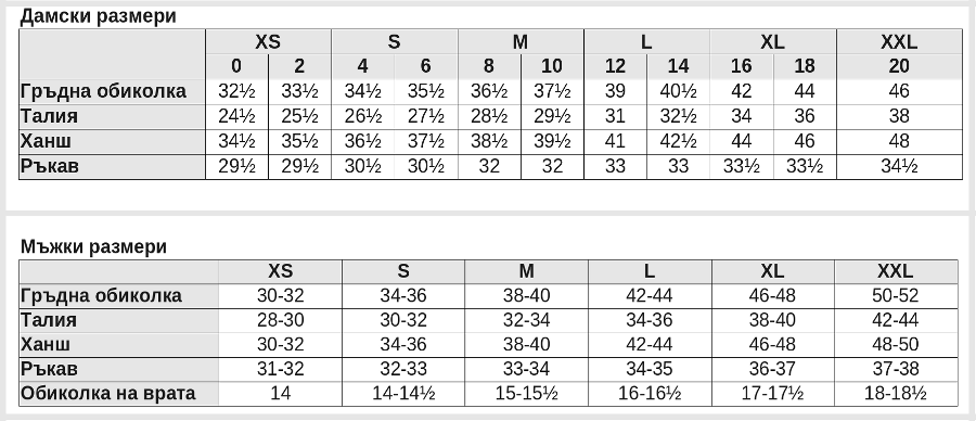 Таблица с размери на дрехи