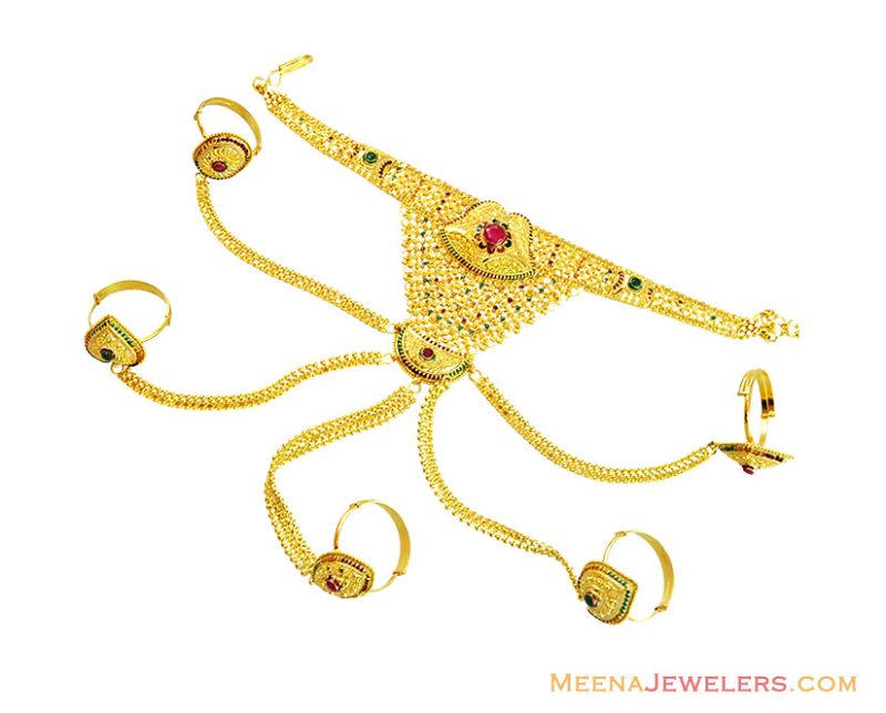 22k Златна Дизайнерска Дамска гривна / Panja красив дизайн в глоба и подробна филигранна работа в комбинация с ръчно изработени Meenakari боя емайл. Panja е осеян със скъпоценни рубин и изумрудени камъни, свързани с петте пръстена (регулируема) в блясък финал.
