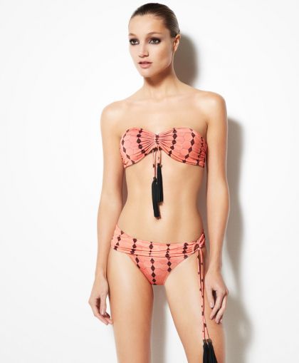Бански от две части с изключително закачлив аксесоар – и горната, и долната част са украсени с дълги връзки с писклюли накрая. Закачлив, но едновремнно елегантен модел.